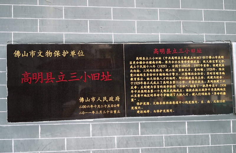 高明縣立三小舊址(中共高明縣支部成立舊址)位于佛山市高明區(qū)更合鎮(zhèn)合水墟南水路。原為合水寶賢學堂鎮(zhèn)波廟,故又稱寶賢義學。成立于1929年,分別于1983年、1997年重修。該建筑座北向南,三間兩進格局。硬山頂,素胎瓦當,青磚墻。1928年,陳汝棠以編練員身份回鄉(xiāng)編練地方警衛(wèi),以整頓社會治安。在其目睹當?shù)亟逃浜螅狈ε囵B(yǎng)人才的場所后,即以鎮(zhèn)波廟為主體,改建而成校舍,于1929年春正式成立了高明縣第三小學,并親任校長。期間組建了以反帝、反封建為宗旨的進步社團“力社”,培養(yǎng)了一批革命志士。1938年中共高明縣第一個支部在此地成立。該校在抗日戰(zhàn)爭中為高鶴地區(qū)以至粵中地區(qū)的革命斗爭輸送了大批人才。被人們頌稱為“革命的搖籃”。